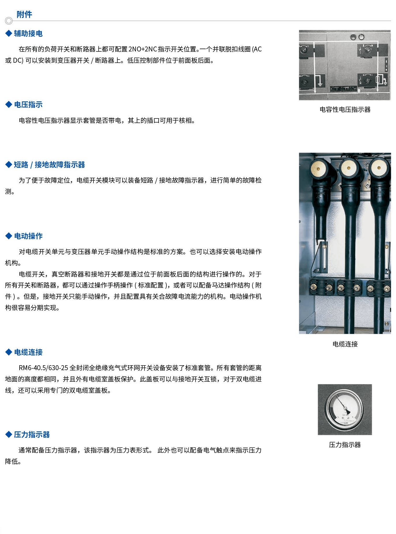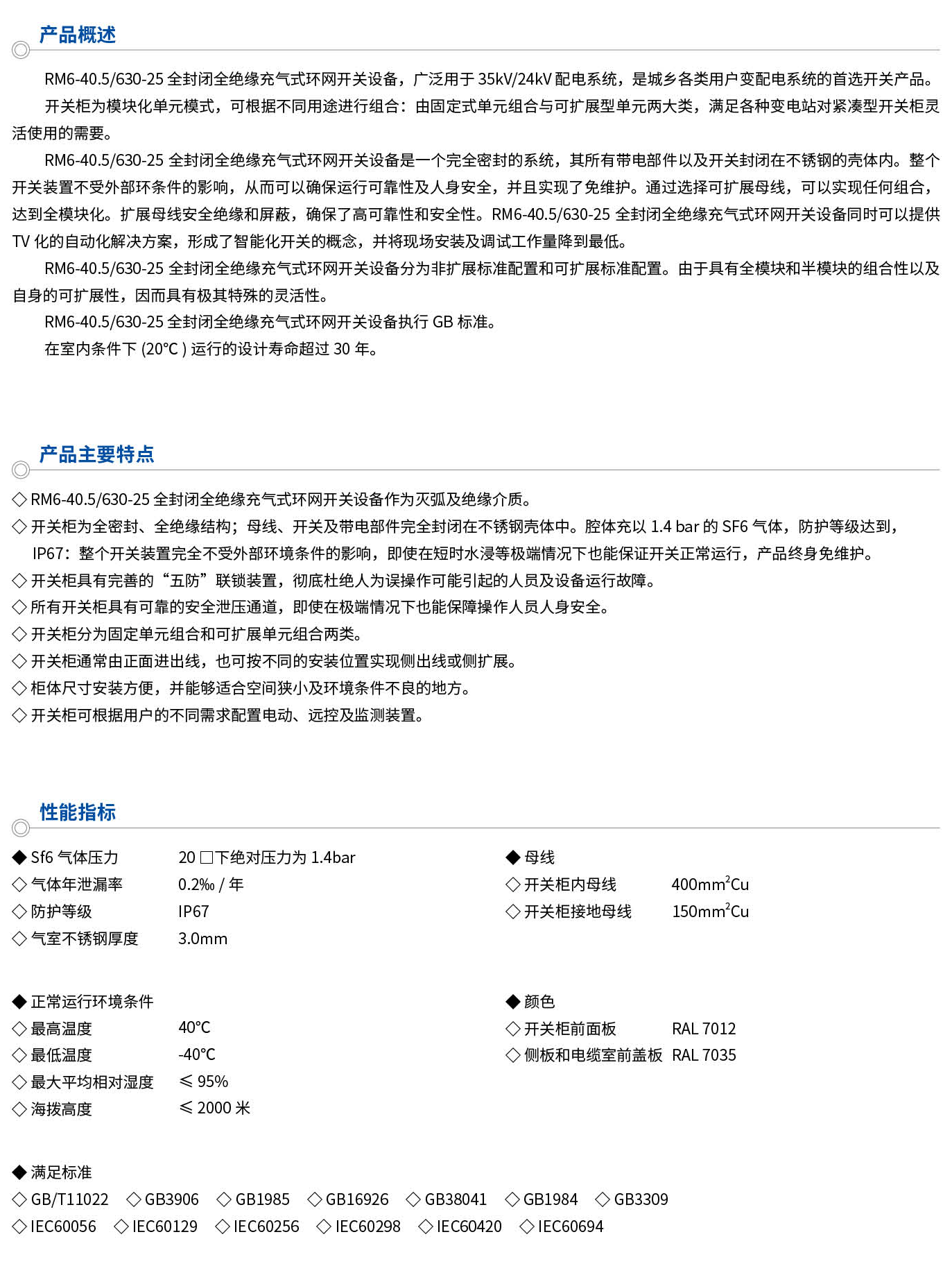 RM6-40.5/630-25全封闭全绝缘充气式环网开关设备,广泛用于35kV/24kV配电系统,是城乡各类用户变配电系统的首选开关产品。开关柜为模块化单元模式,可根据不同用途进行组合:由固定式单元组合与可扩展型单元两大类,满足各种变电站对紧凑型开关柜灵活使用的需要。